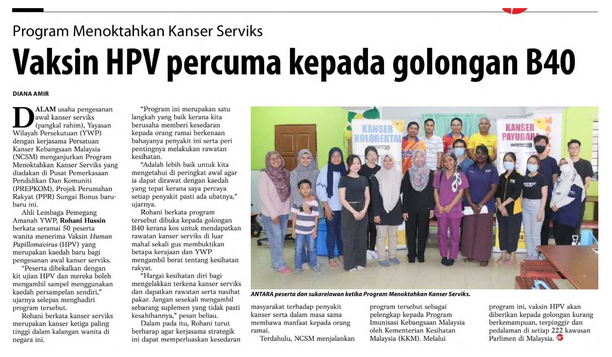 • Lebih 70,000 wanita mendapat vaksin HPV semasa kempen masyarakat kanser nasional